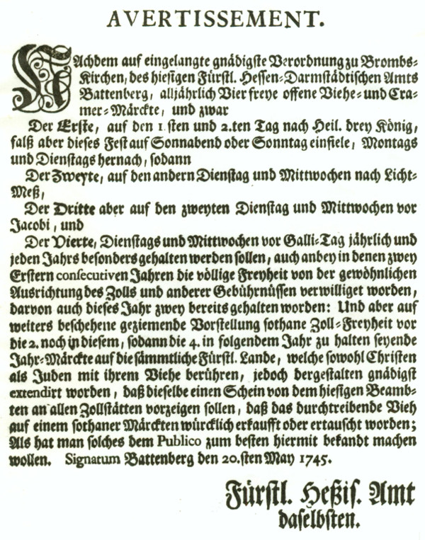 "Avertissement" (französisch für "Warnhinweis / Vorwarnung") der landgräflichen Administration aus dem Jahre 1745, daß für jedes auf den vier jährlichen Bromskircher Märkten erkaufte oder ertauschte Stück Vieh ein Zollschein mitzuführen sei.